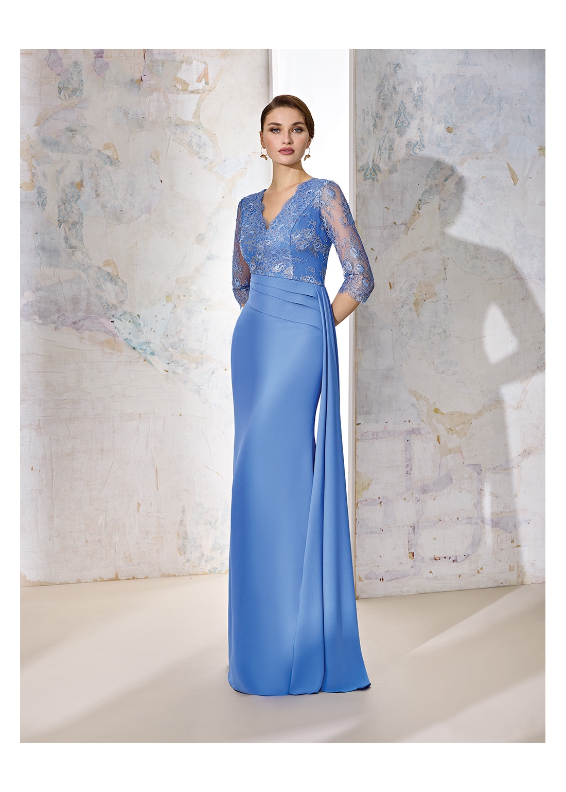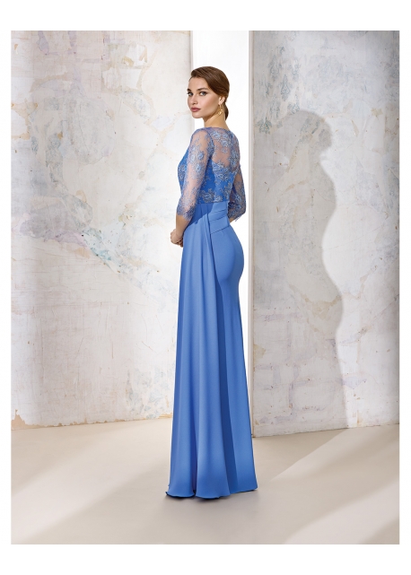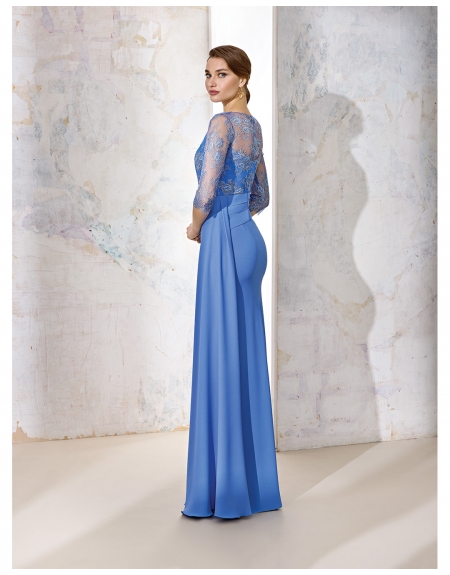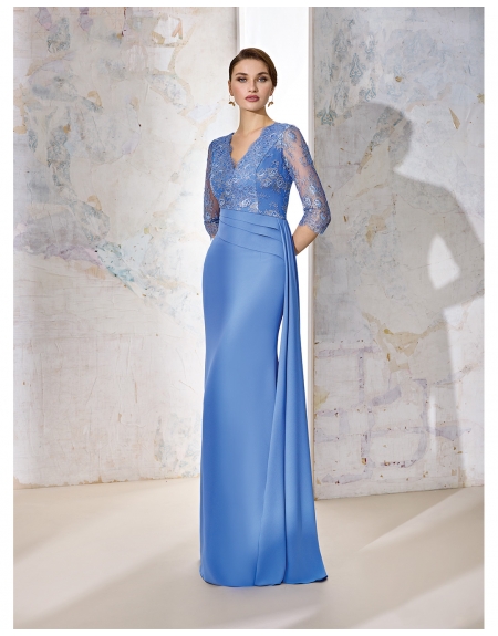 Vestido en Crepé con cuerpo de encaje chantilly y manga francesa con escote de en V
