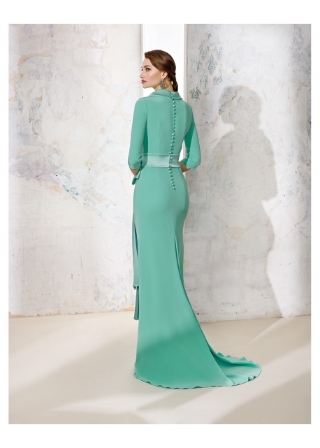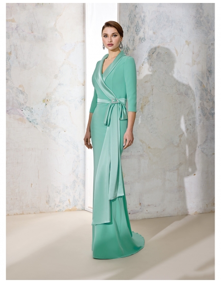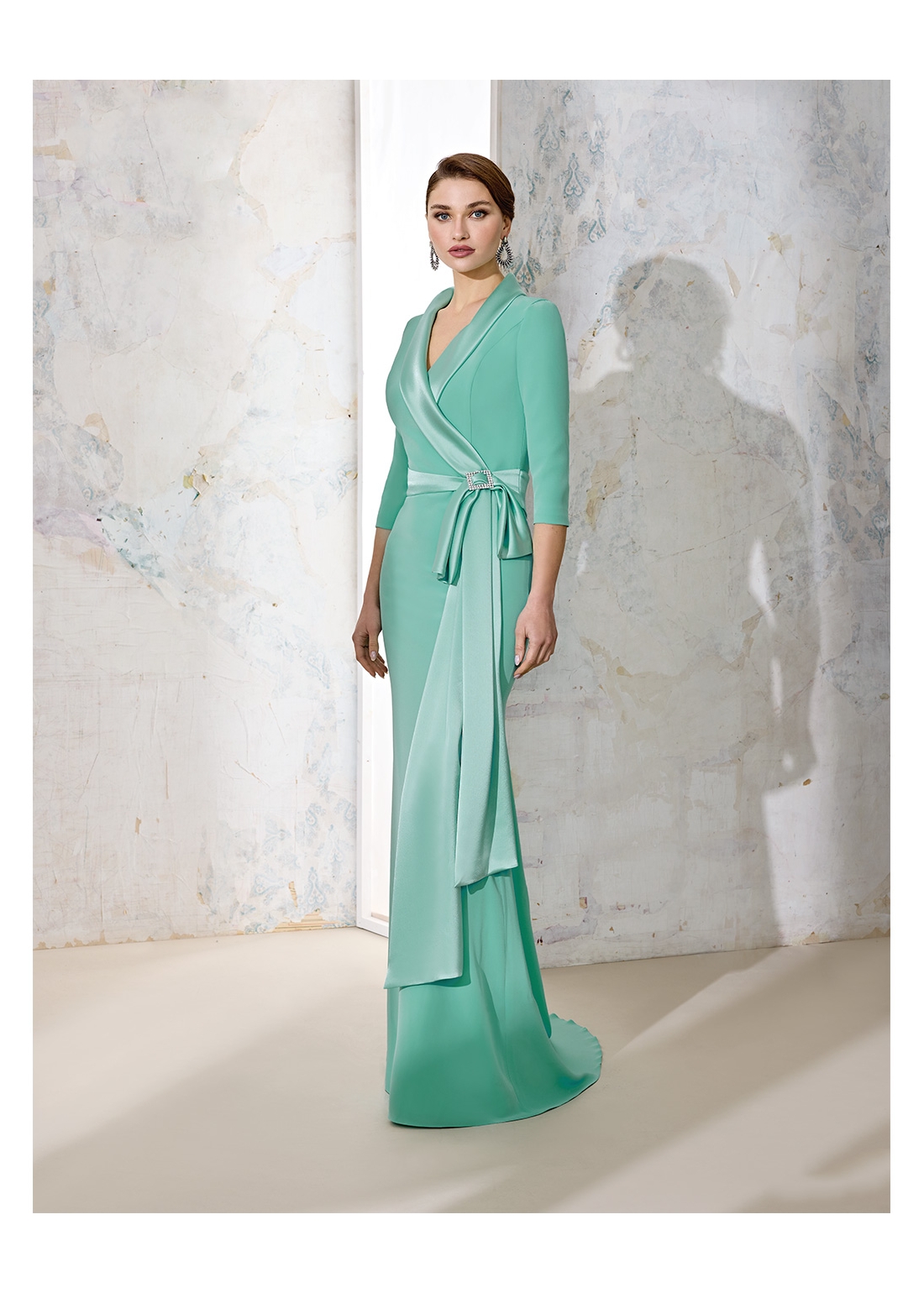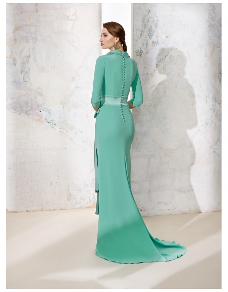 Vestido en Crepé triacetato con hebilla joya, escote de smoquin y caidas a contrase.