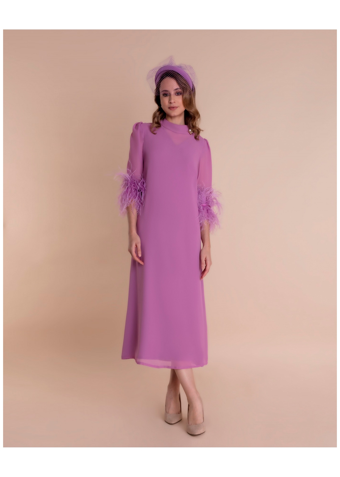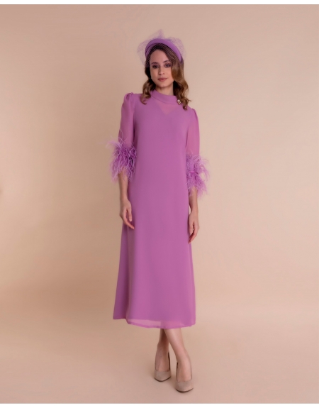 Vestido de Madrina midi confeccionado en georgette con remate de plumas a tono.