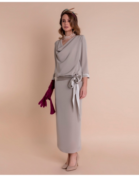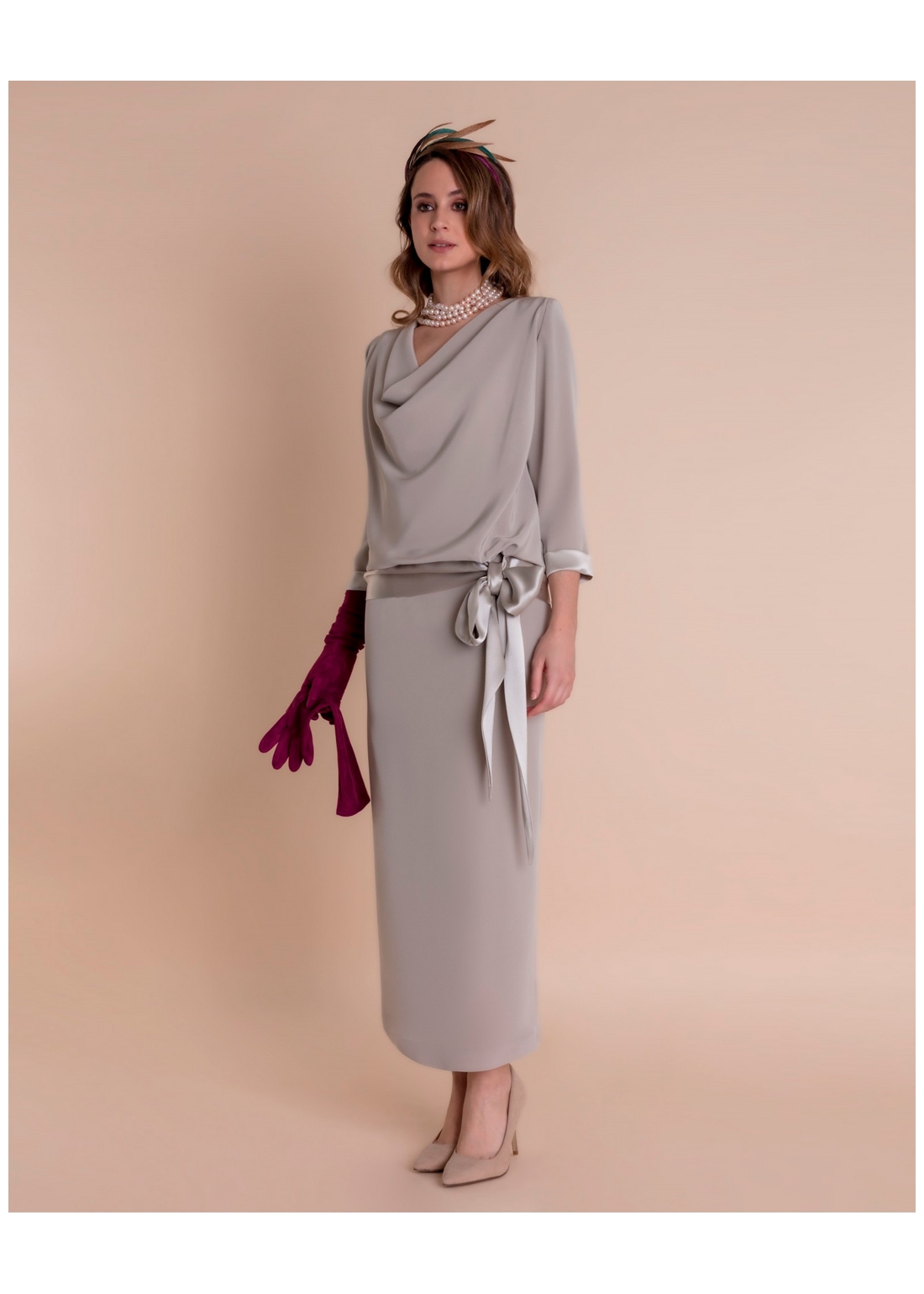 Vestido de Madrina largo realizado en crepé sedoso con drapeado y corte bajo en cadera estilo años 20.