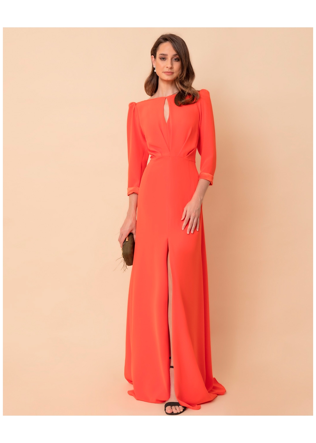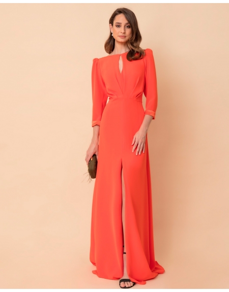 Vestido de Madrina largo realizado en crepé sedoso con original escote y abertura frontal